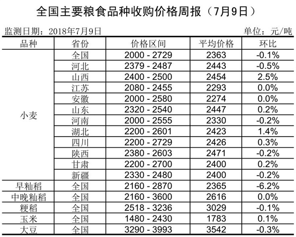 全国主要粮食品种收购价格周报(7月9日)