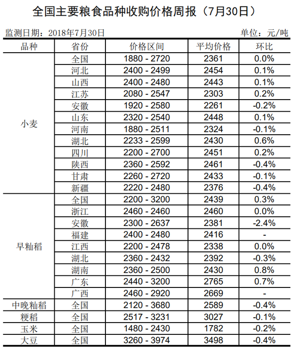 全国主要粮食品种收购价格周报(7月30日)