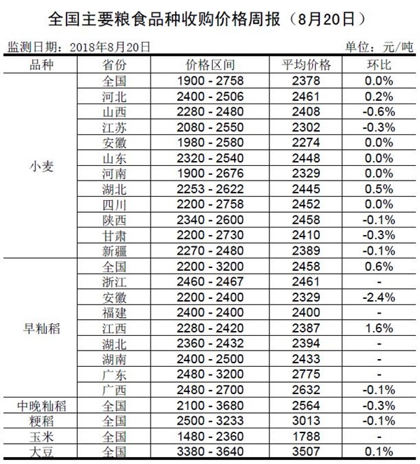 全国主要粮食品种收购价格周报(8月20日)
