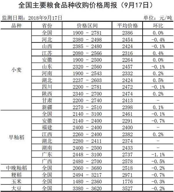 全国主要粮食品种收购价格周报(9月17日)