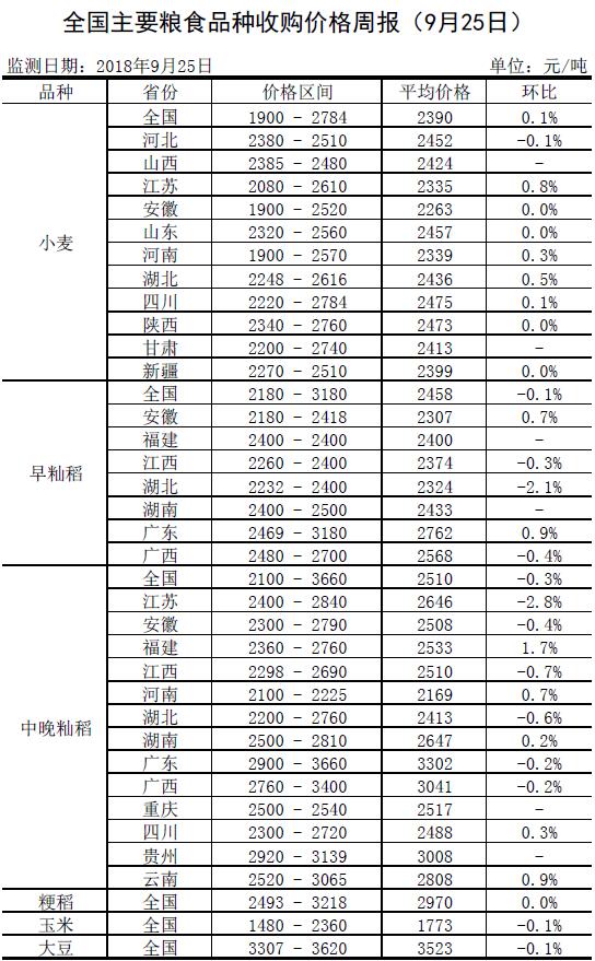全国主要粮食品种收购价格周报(9月25日)