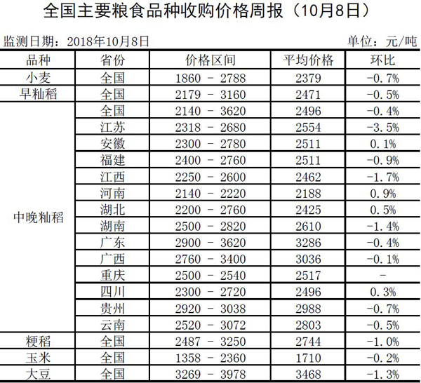 全国主要粮食品种收购价格周报(10月8日)