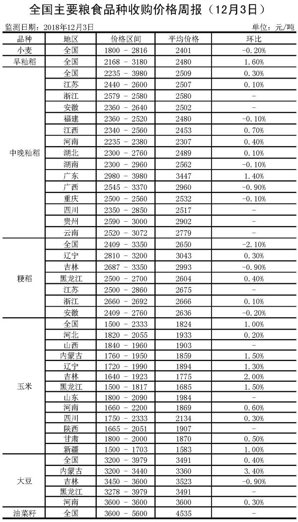 全国主要粮食品种收购价格周报(12月3日)