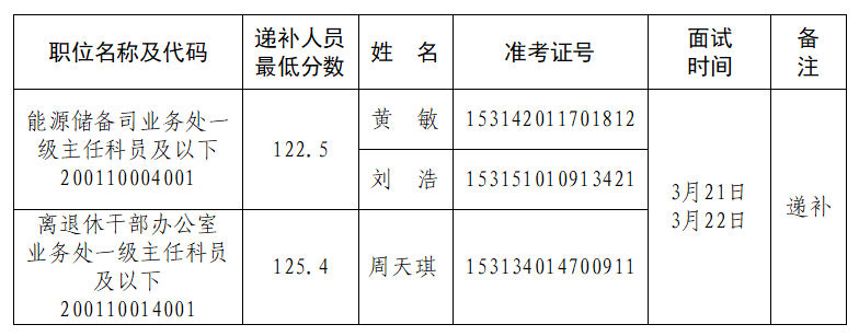 《国家粮食和物资储备局2026年度考试录用公务员面试公告》发布后,因部分考生自愿放弃面试资格,根据公务员录用工作有关规定,在公共科目笔试合格的考生中,按照笔试成绩从高到低的顺序,递补以下考生为面试人选(同一职位考生按照准考证号排序):